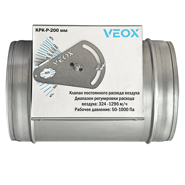 | Клапан постоянного расхода воздуха VEOX VEOX КРК-D200, расход 320-1200 м3/ч, 50-1000 Па с пневмоамортизатором, стальной корпус, наружная настройка расхода воздуха | 200 | 320-1200 |